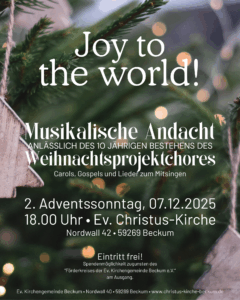 Am 2. Adventssonntag, den 7. Dezember, um 18:00 Uhr lädt der Weihnachtsprojektchor der Evangelischen Kirchengemeinde Beckum zu einer musikalischen Andacht in die Christus-Kirche ein.