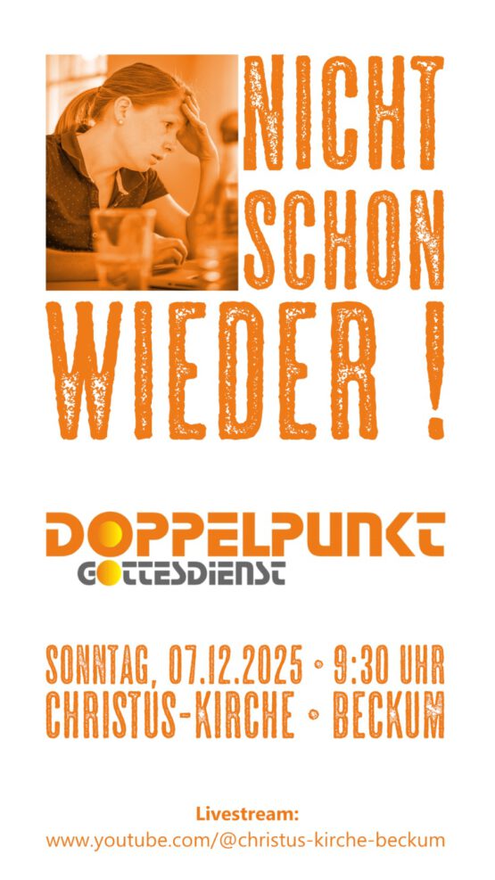 Am zweiten Adventssonntag, 7. Dezember, lädt die Evangelische Kirchengemeinde Beckum zum Doppelpunkt-Gottesdienst um 9:30 Uhr in die Christus-Kirche am Nordwall ein. Das Doppelpunkt-Team hat dafür das Thema „Nicht schon wieder!“ ausgewählt und vorbereitet.