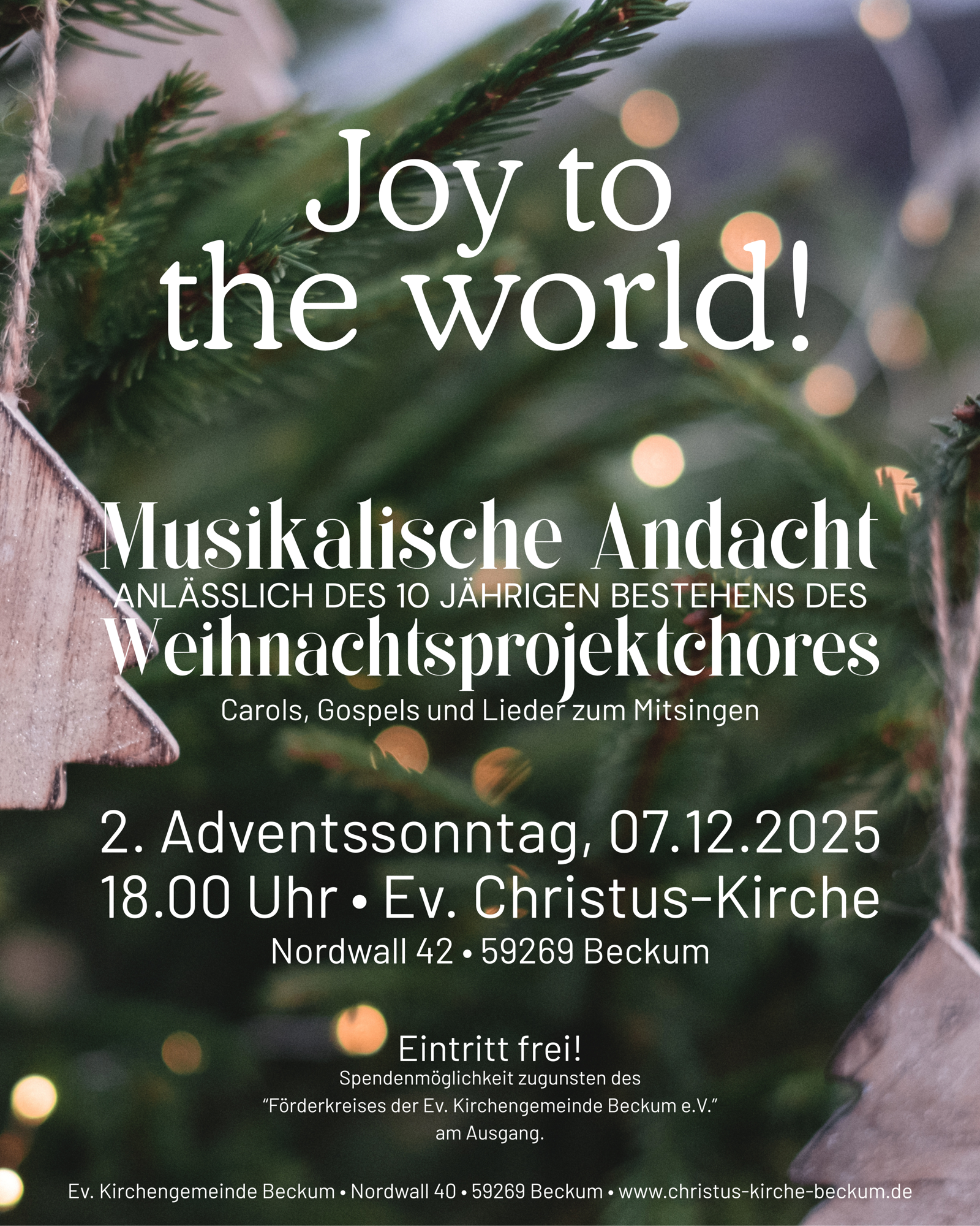 Am 2. Adventssonntag, den 7. Dezember, um 18:00 Uhr lädt der Weihnachtsprojektchor der Evangelischen Kirchengemeinde Beckum zu einer musikalischen Andacht in die Christus-Kirche ein.
